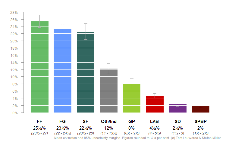We have integrated these two surveys into the Irish Pooling Indicator. In our updated estimates, Fianna Fáil rank between 23.5 and 27 per cent. Fine Gael ranges between 22 and 24.5 per cent. Sinn Féin is on 20.5 to 25 per cent, a remarkably increase from the estimated 15 to 18.5 per cent which we reported two weeks ago.